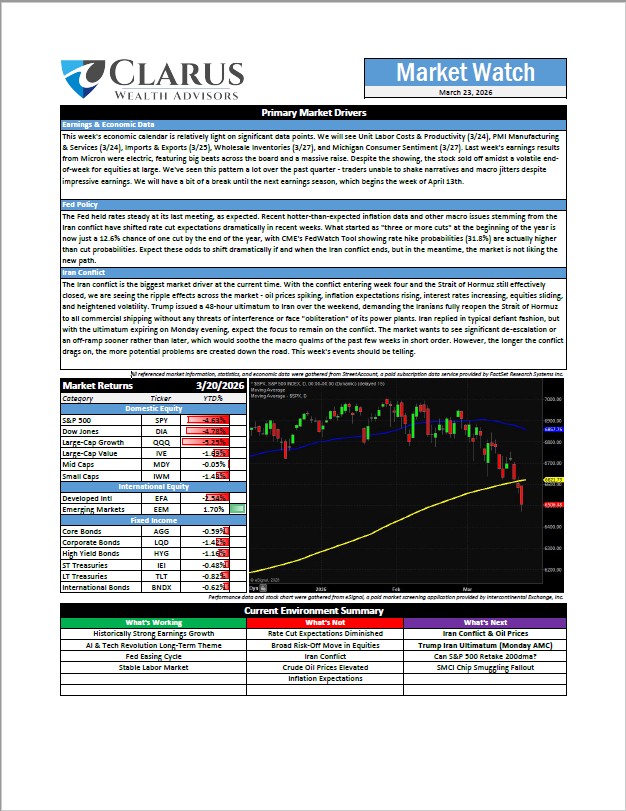 Clarus Wealth Advisors Market Watch March 23, 2026