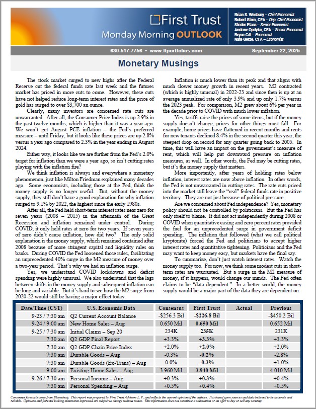 Submitted by Clarus Wealth on September 22nd, 2025First Trust's economists discuss their opinions on whether short-term rate cuts are warranted, in this week's Monday Morning OUTLOOK.