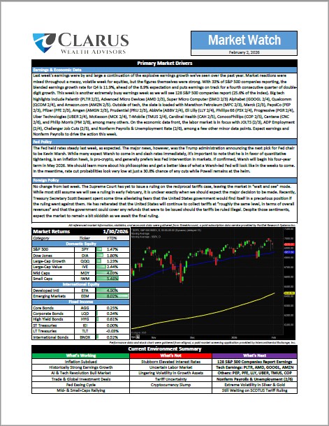 Last week, the Trump administration announced Kevin Warsh as their choice for the Fed Chair. Meanwhile, we continue to await the Supreme Court's reciprocal tariffs ruling. Read more about these, and other factors that may be influencing the markets, in this week's Market Watch.